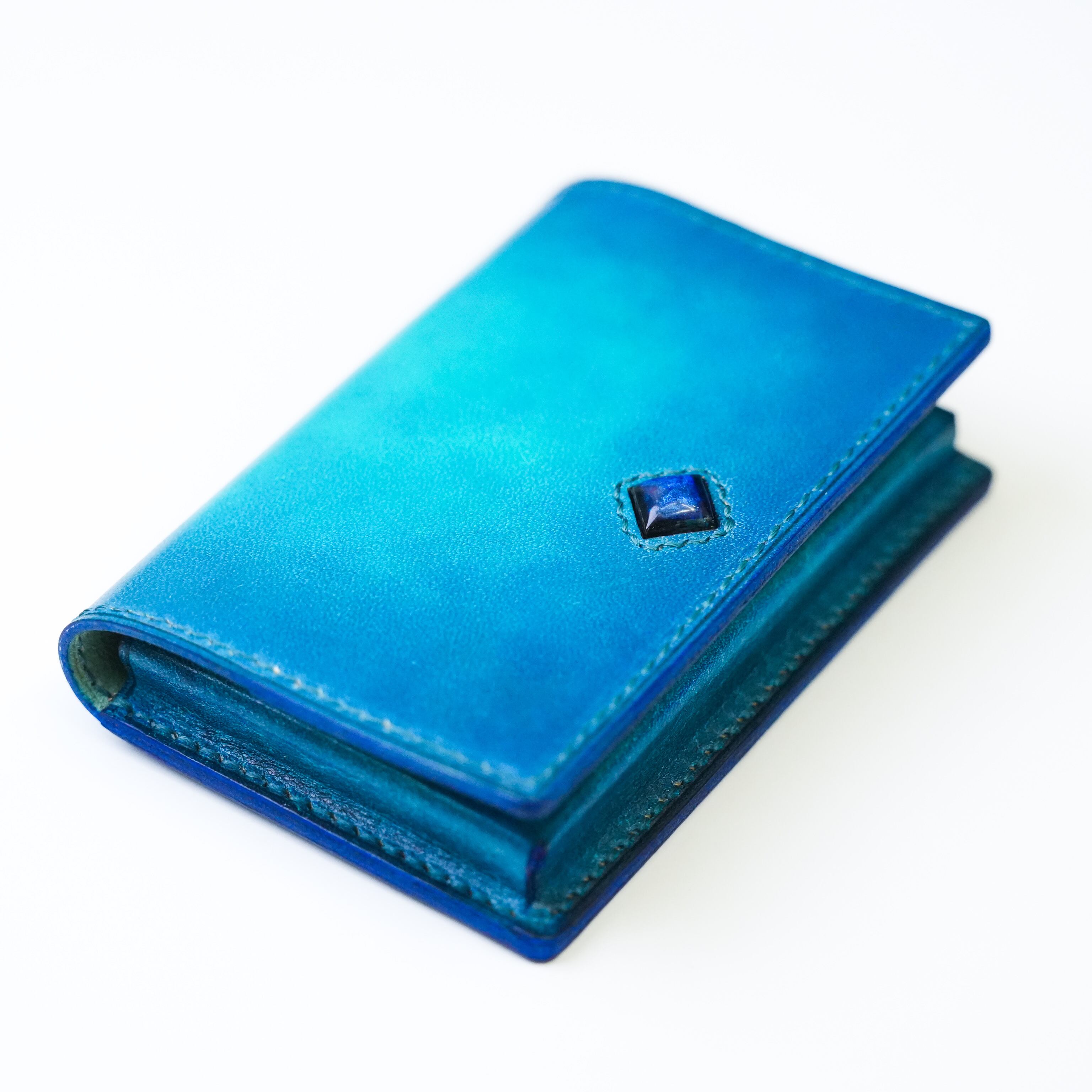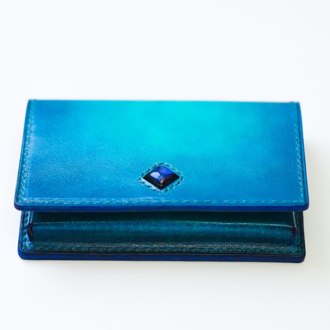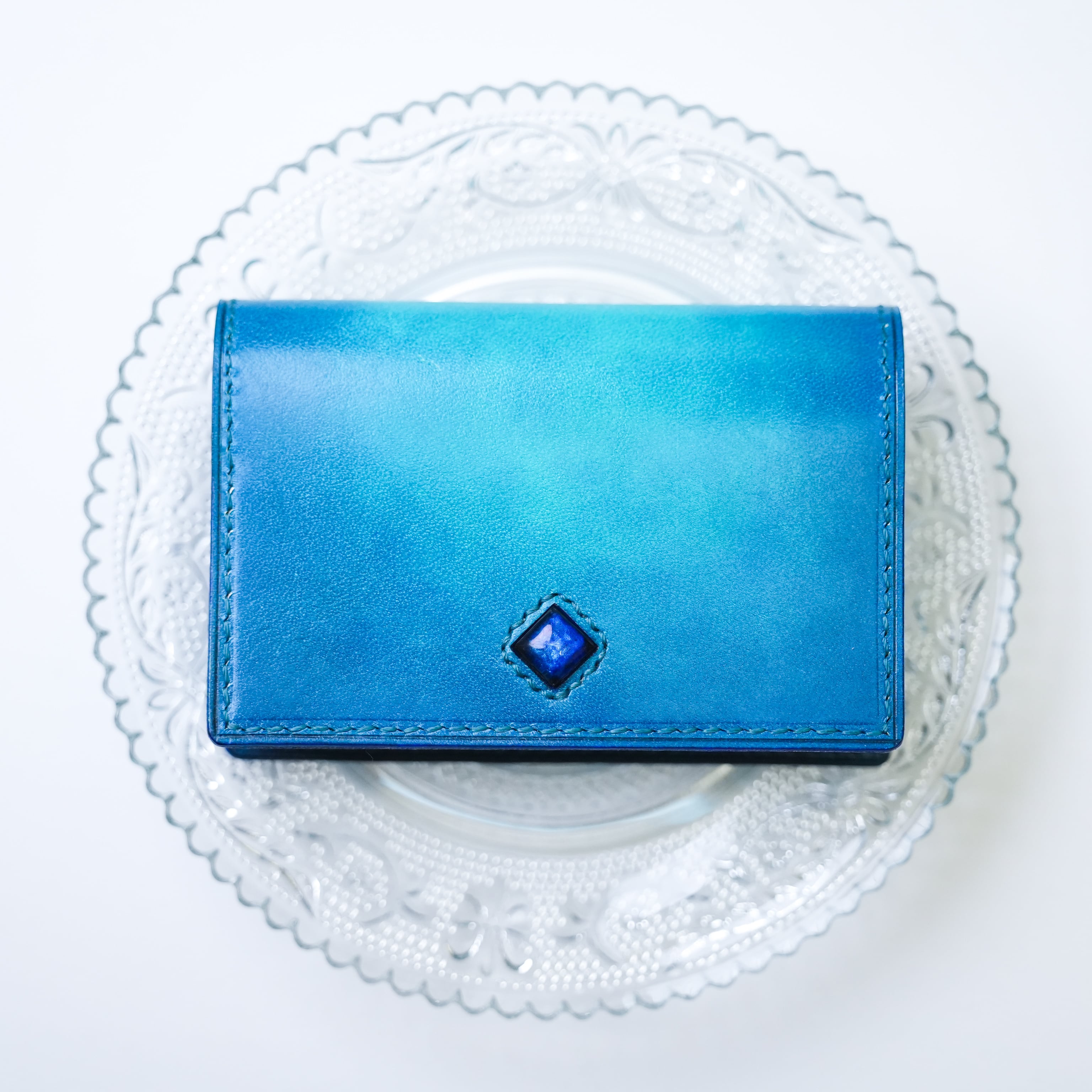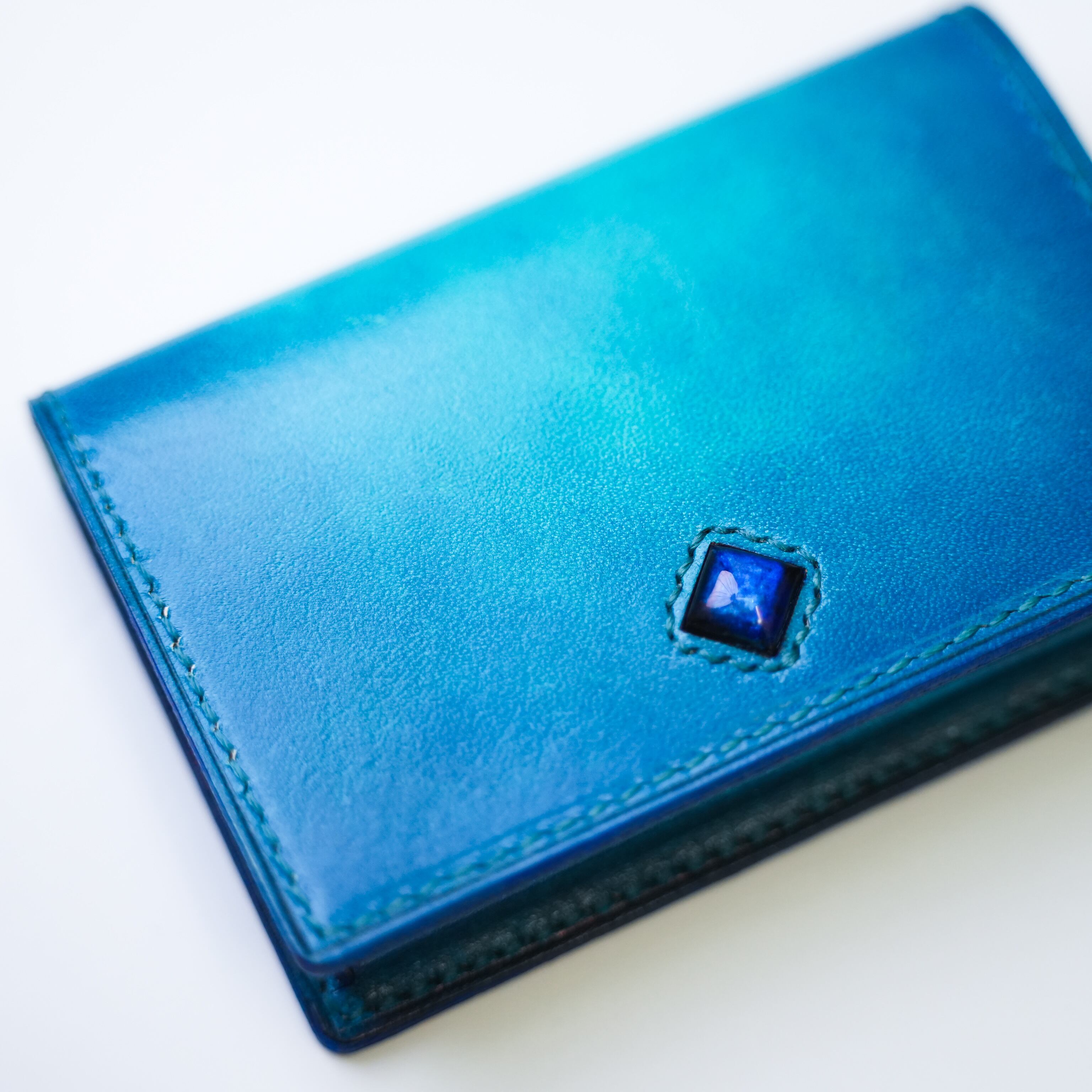 丁寧に手染め作業で仕上げたブルーグラデーションレザーの名刺入れに、ダイヤ型のオーロラのように輝く宝石を取り付けました。