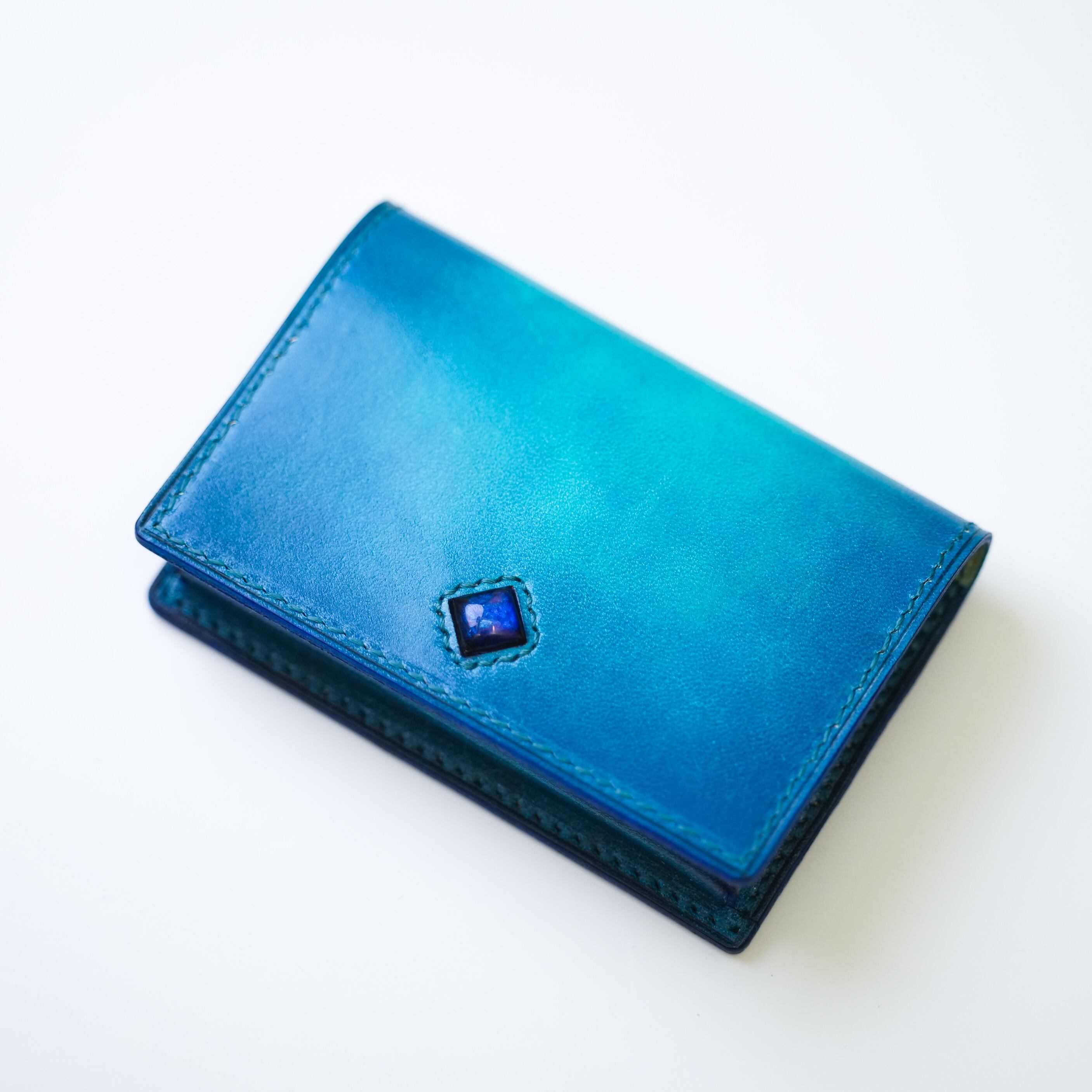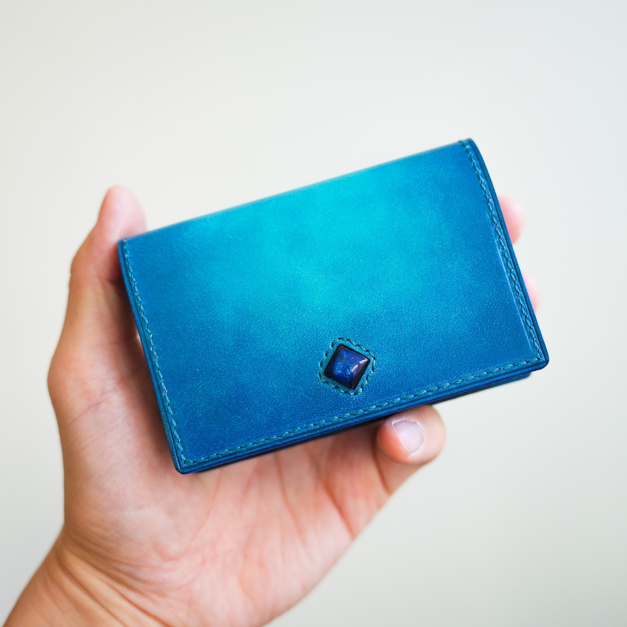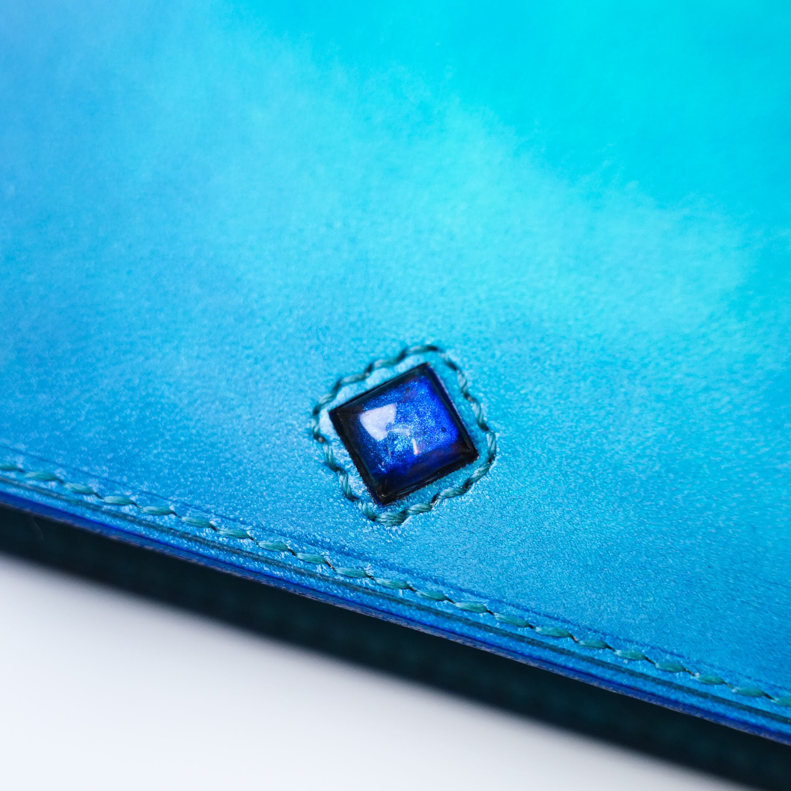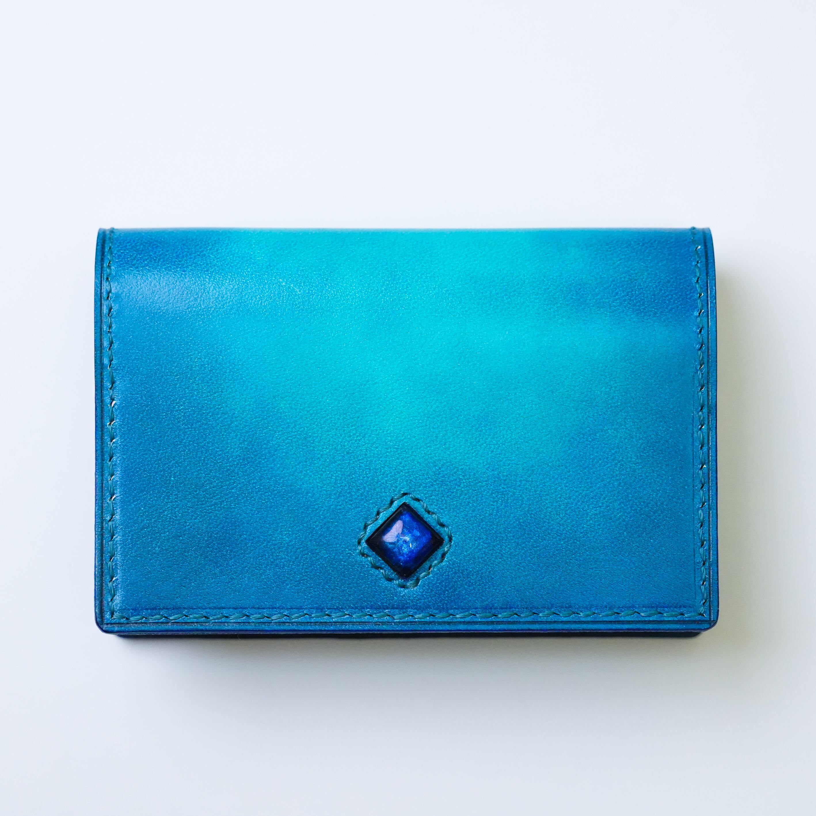 丁寧に手染め作業で仕上げたブルーグラデーションレザーの名刺入れに、ダイヤ型のオーロラのように輝く宝石を取り付けました。