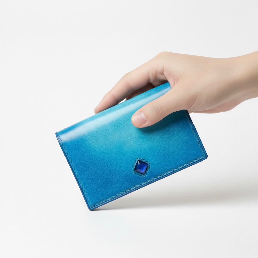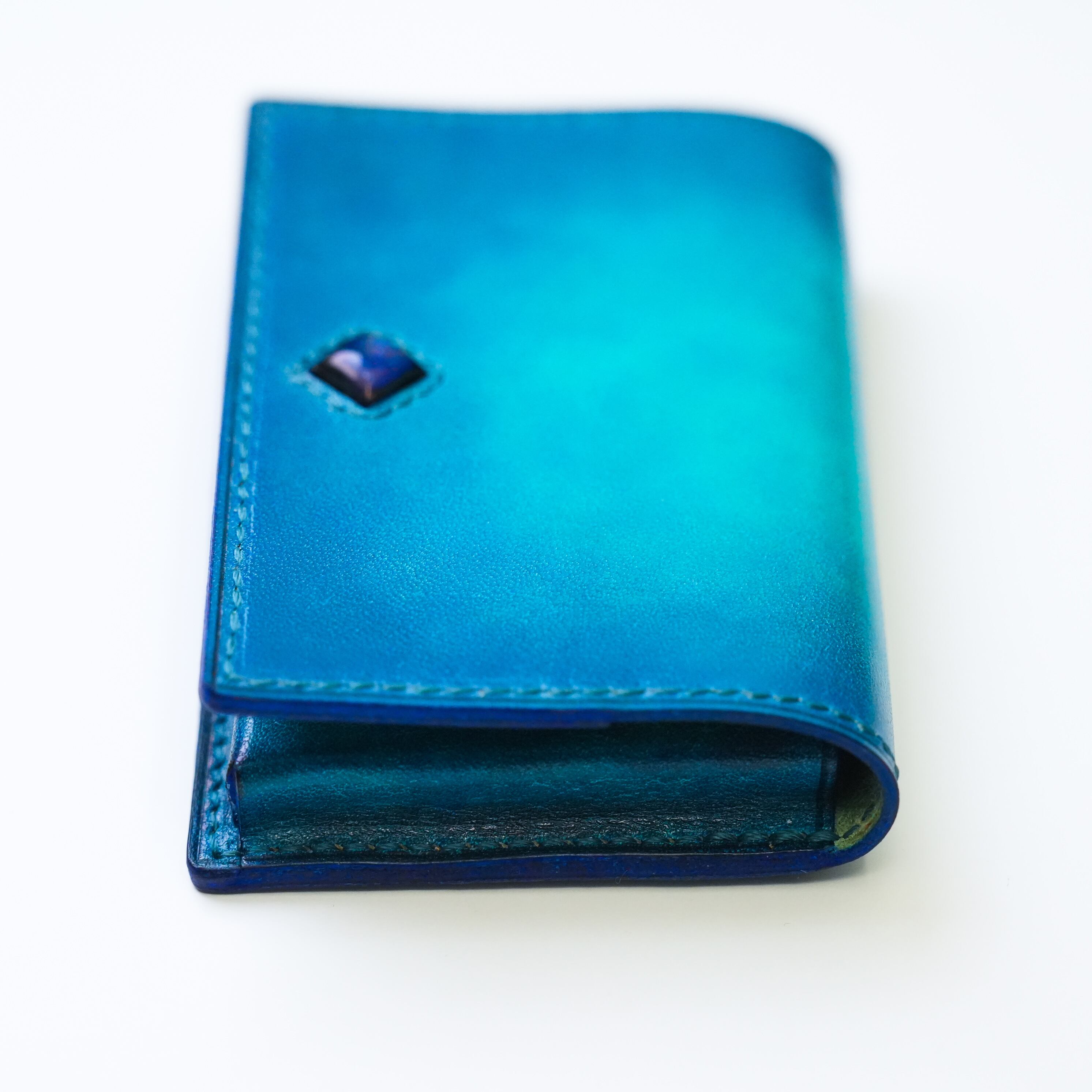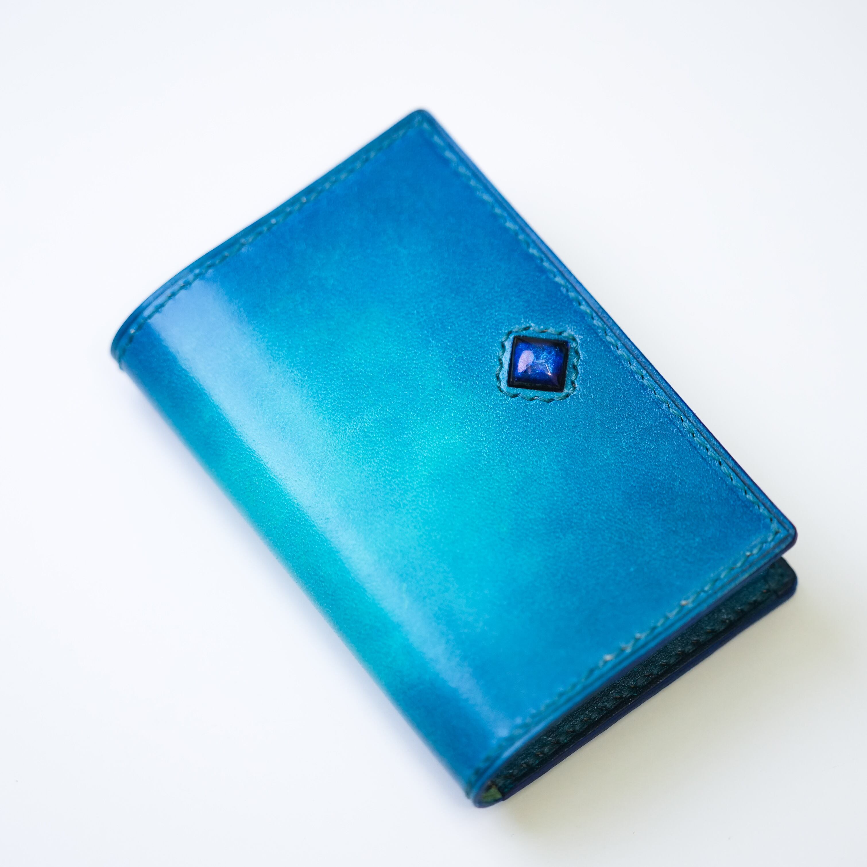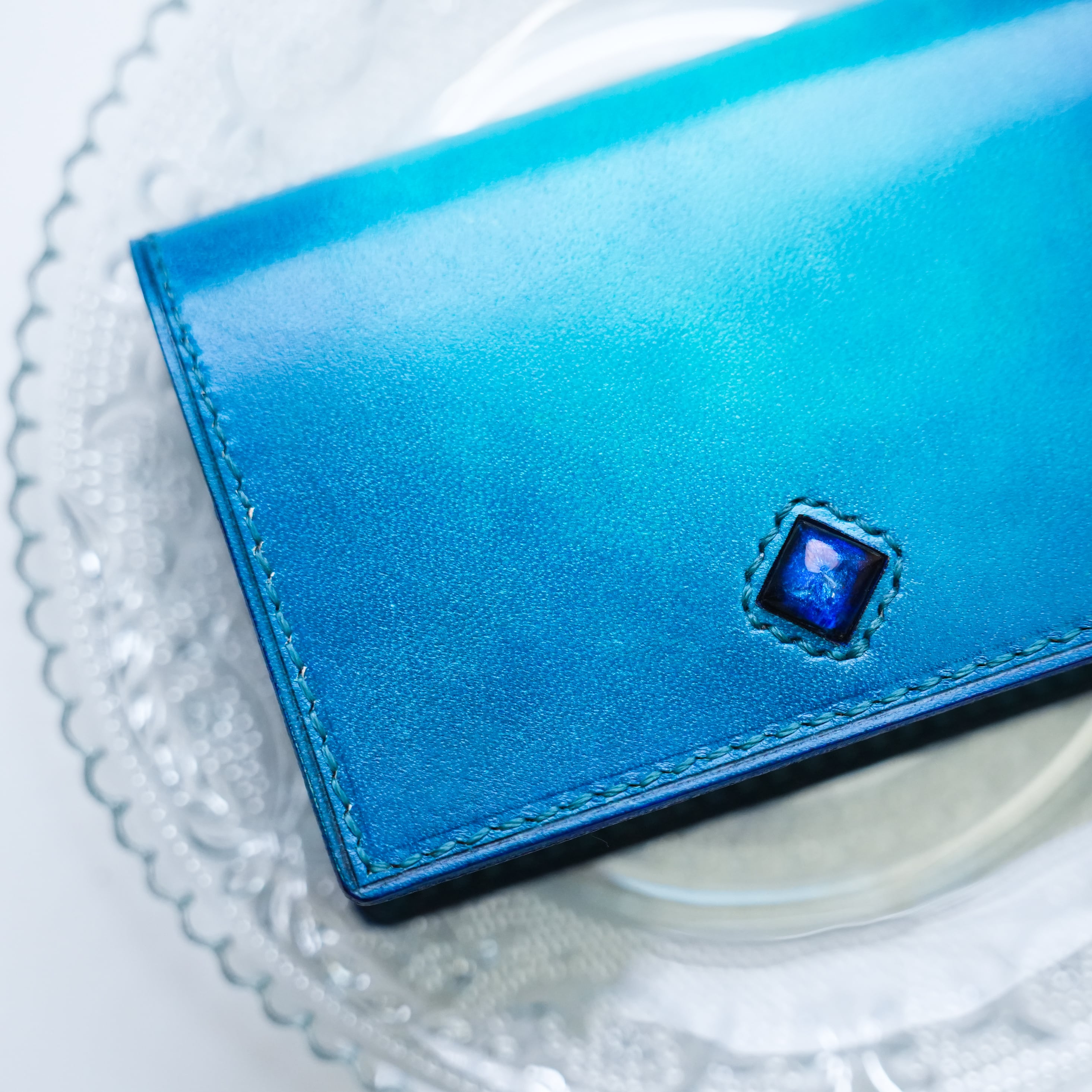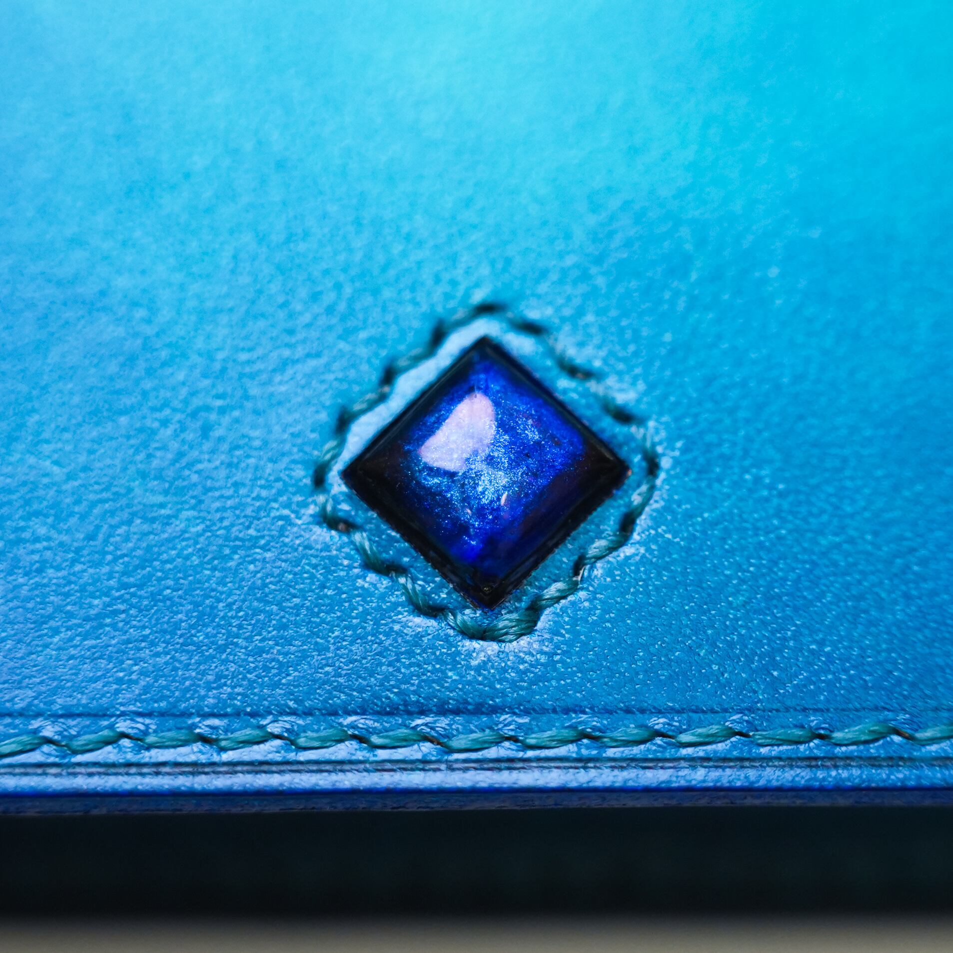 丁寧に手染め作業で仕上げたブルーグラデーションレザーの名刺入れに、ダイヤ型のオーロラのように輝く宝石を取り付けました。