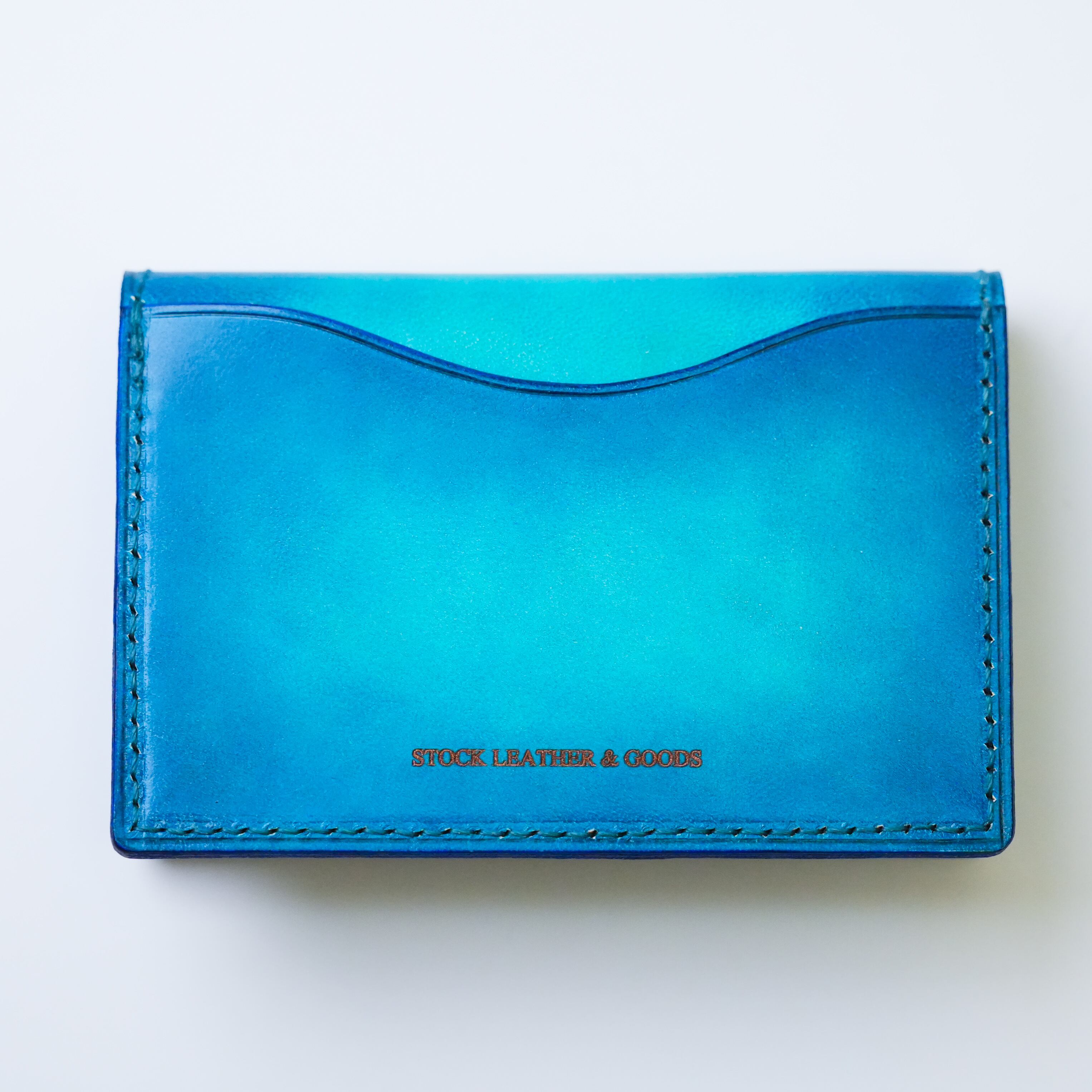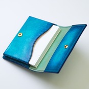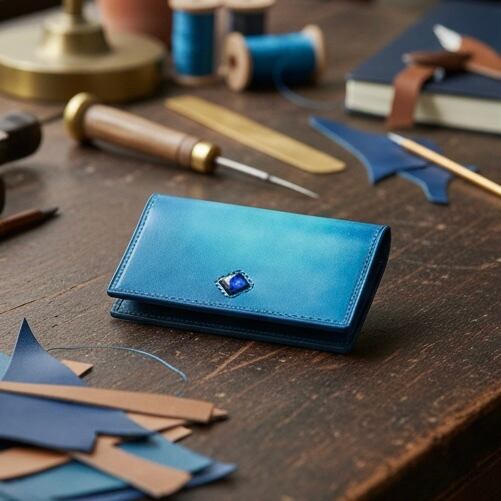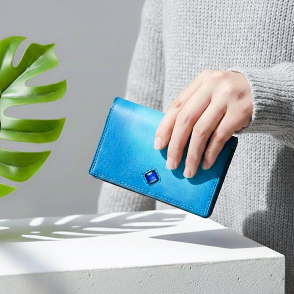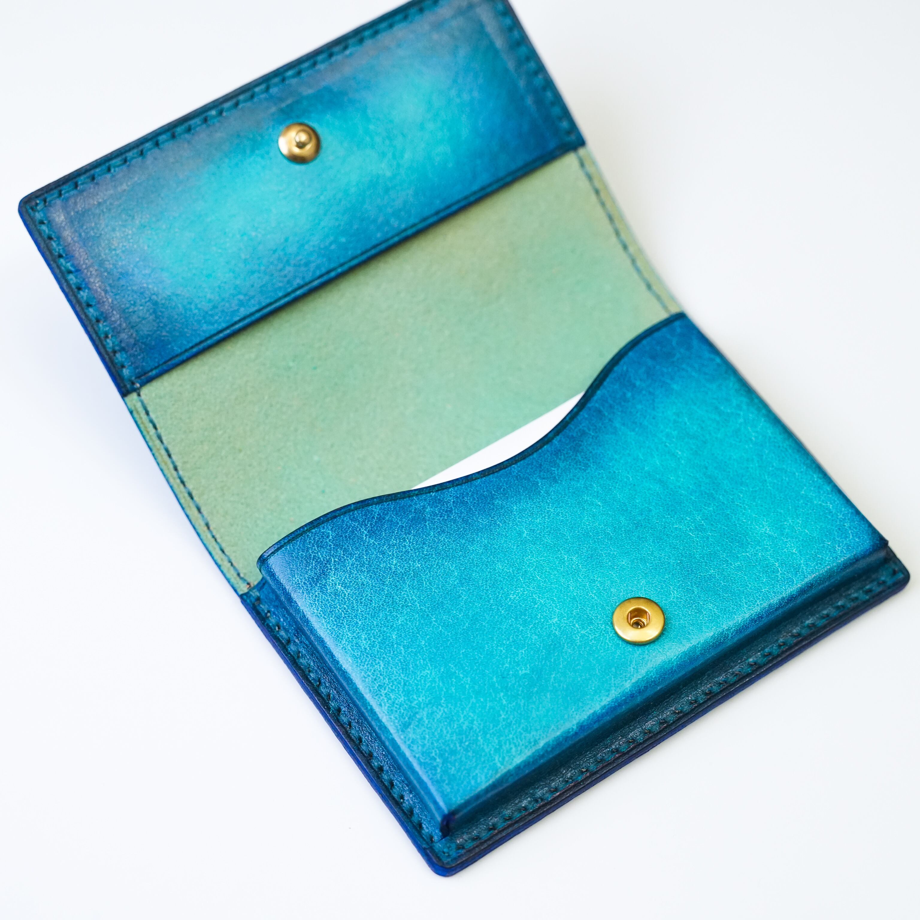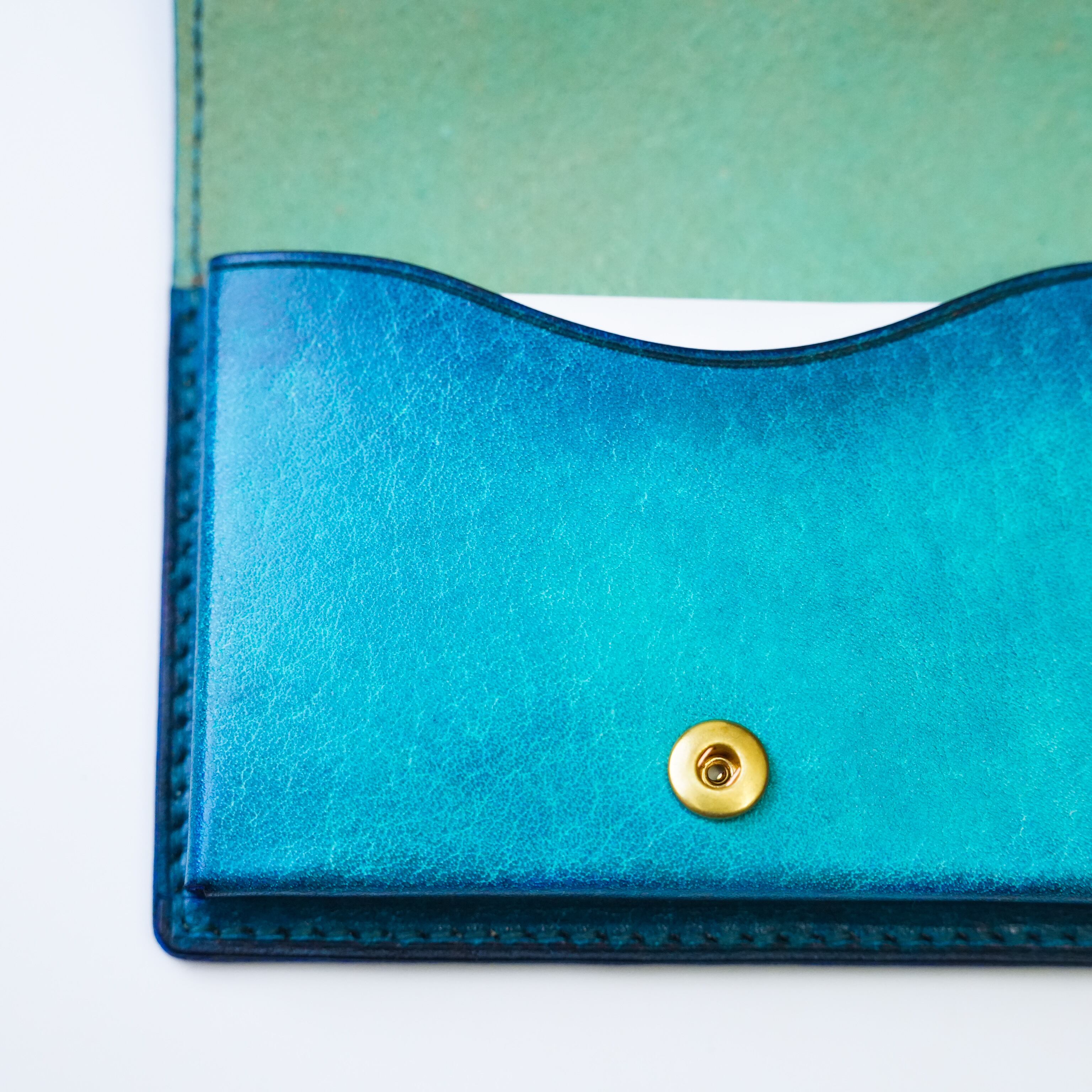 丁寧に手染め作業で仕上げたブルーグラデーションレザーの名刺入れに、ダイヤ型のオーロラのように輝く宝石を取り付けました。