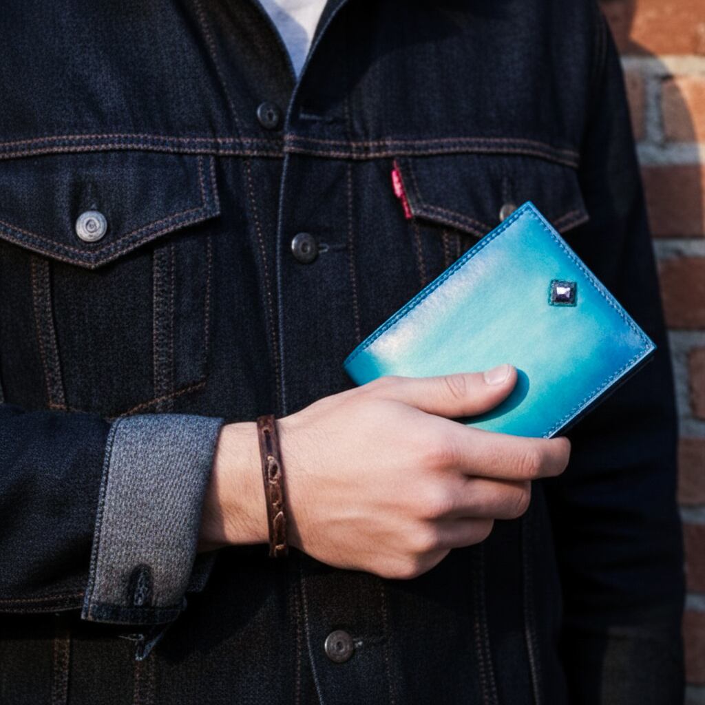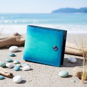 外装の革は、繊維の細かなヌメ革を手染めでブルーグラデーションに仕上げております。天然革なので、シワなどの個体差が一点ずつ異なり 同じ物はございません。