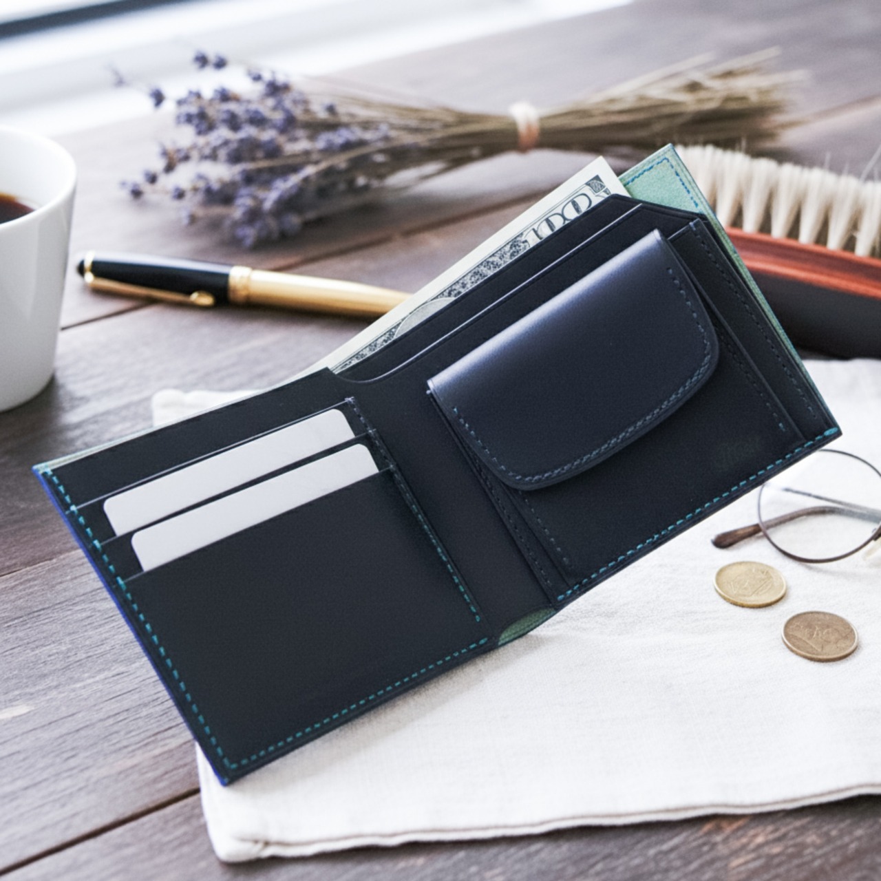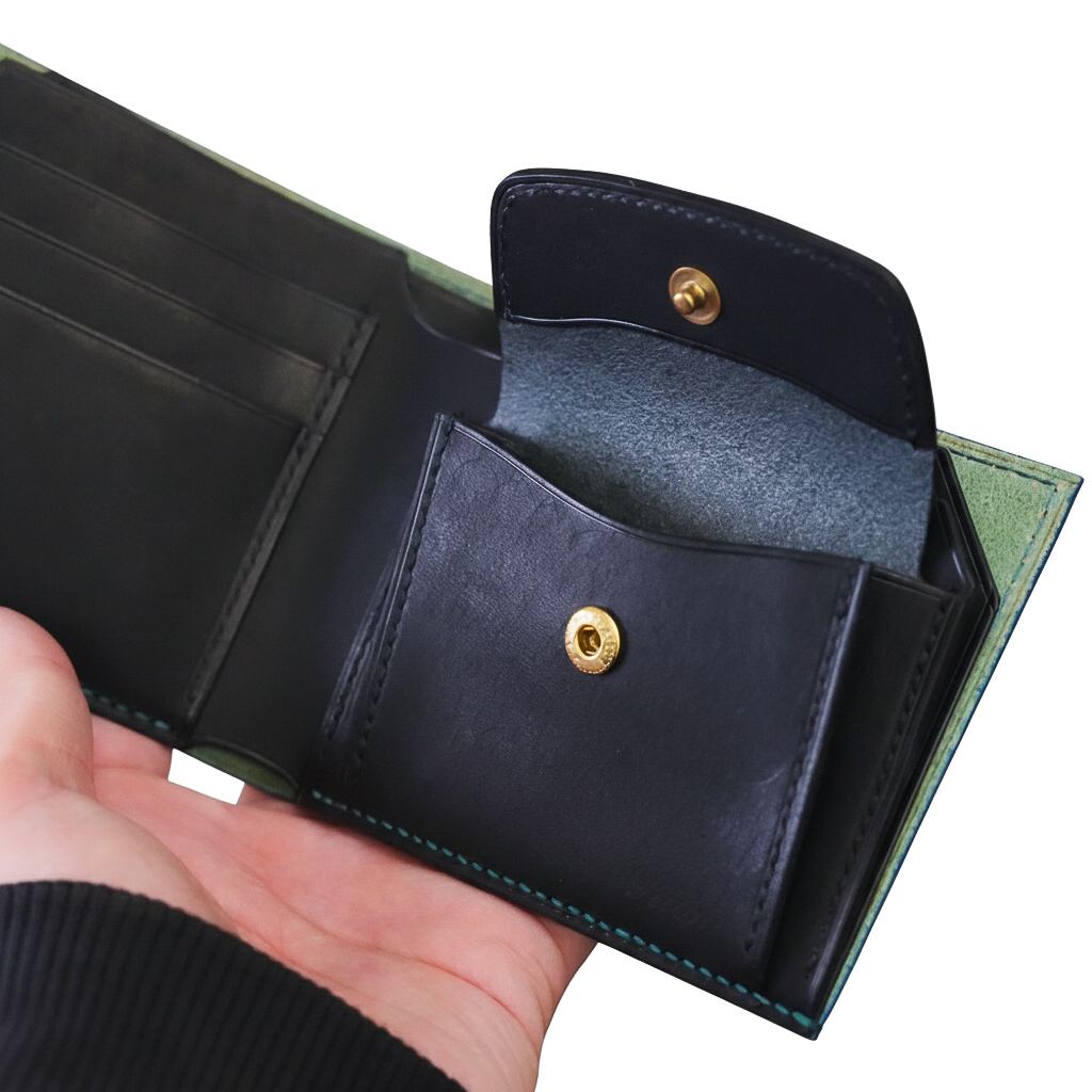 カジュアルにもビジネスにも使える、シンプルな二つ折り財布になります。